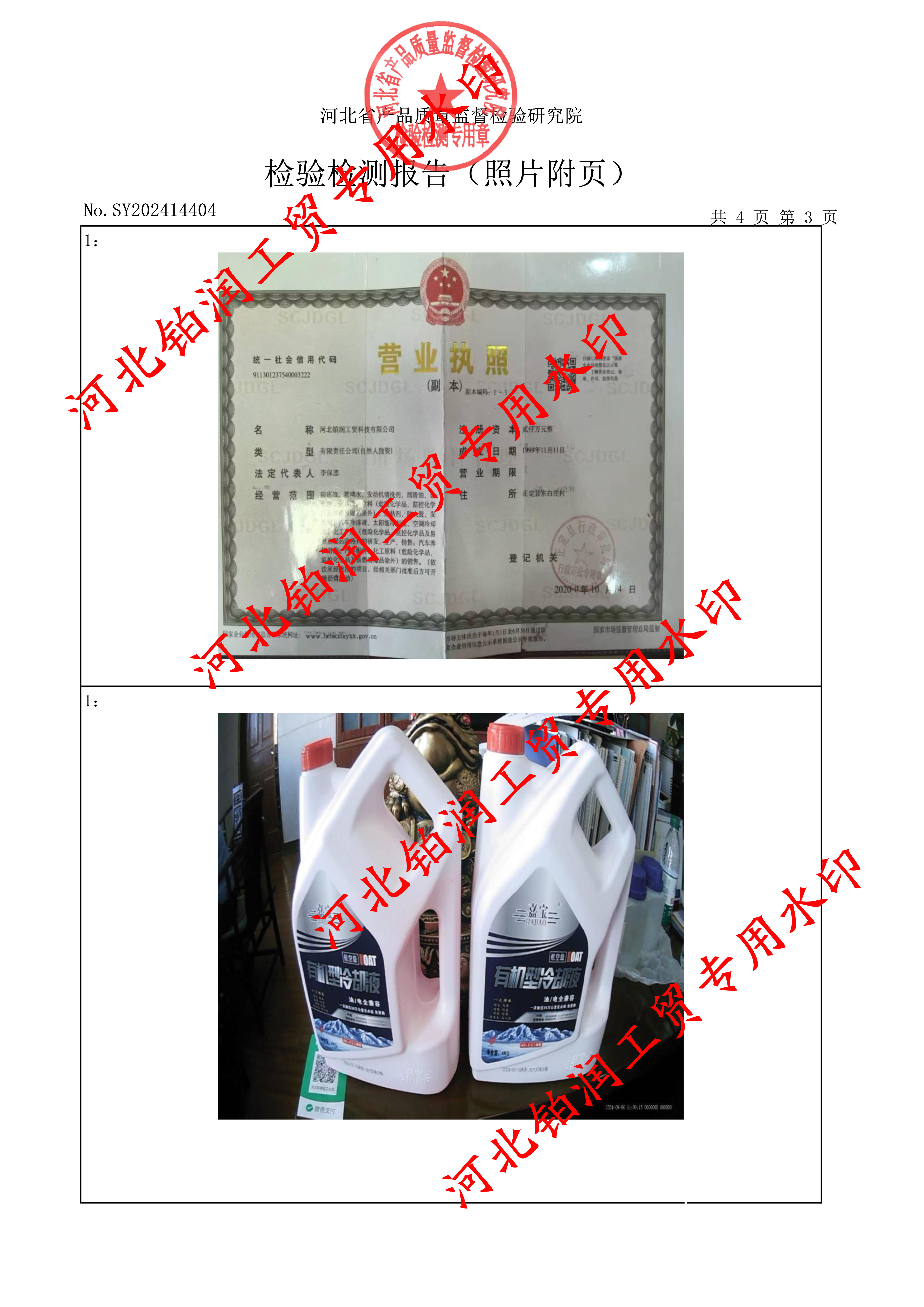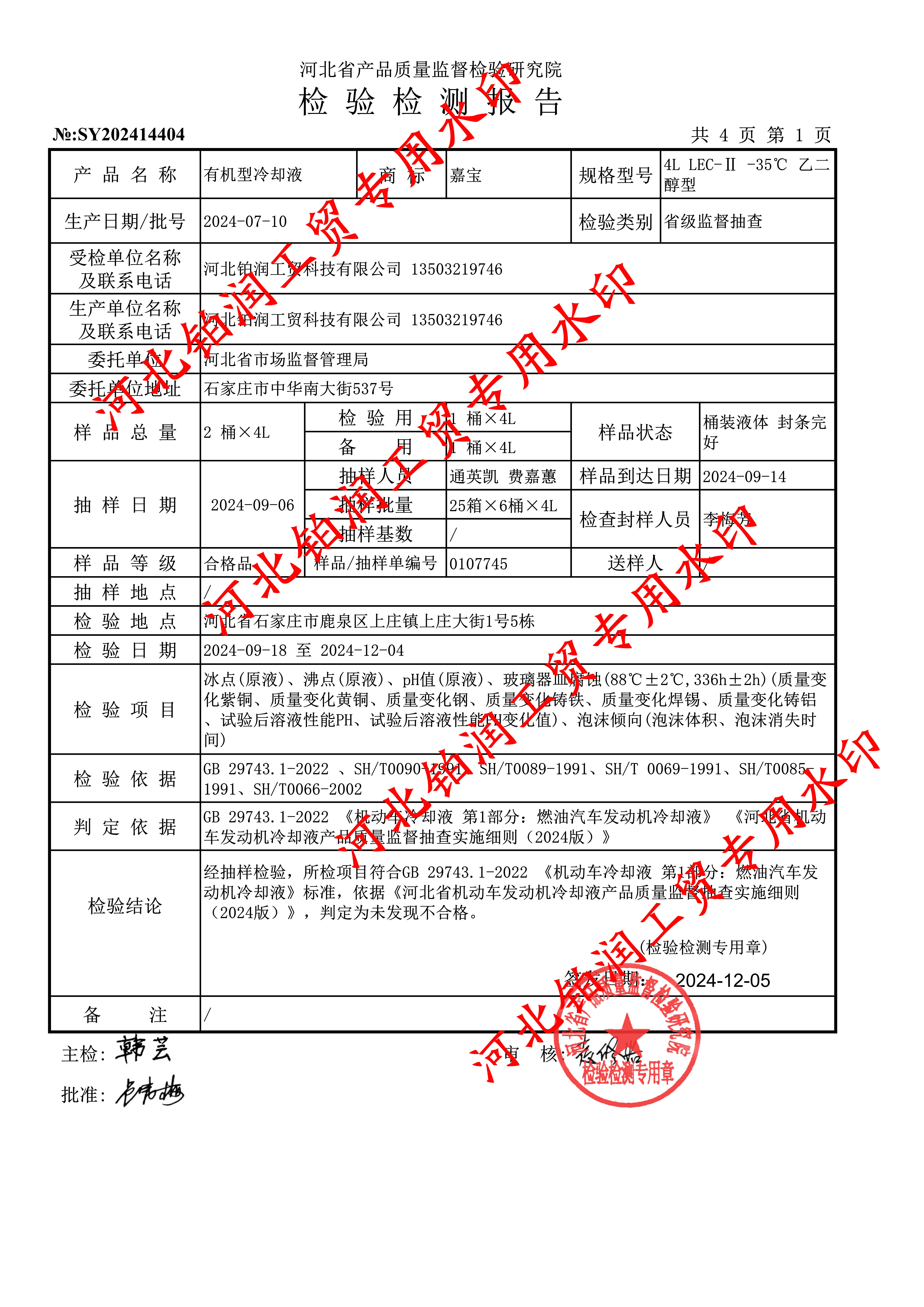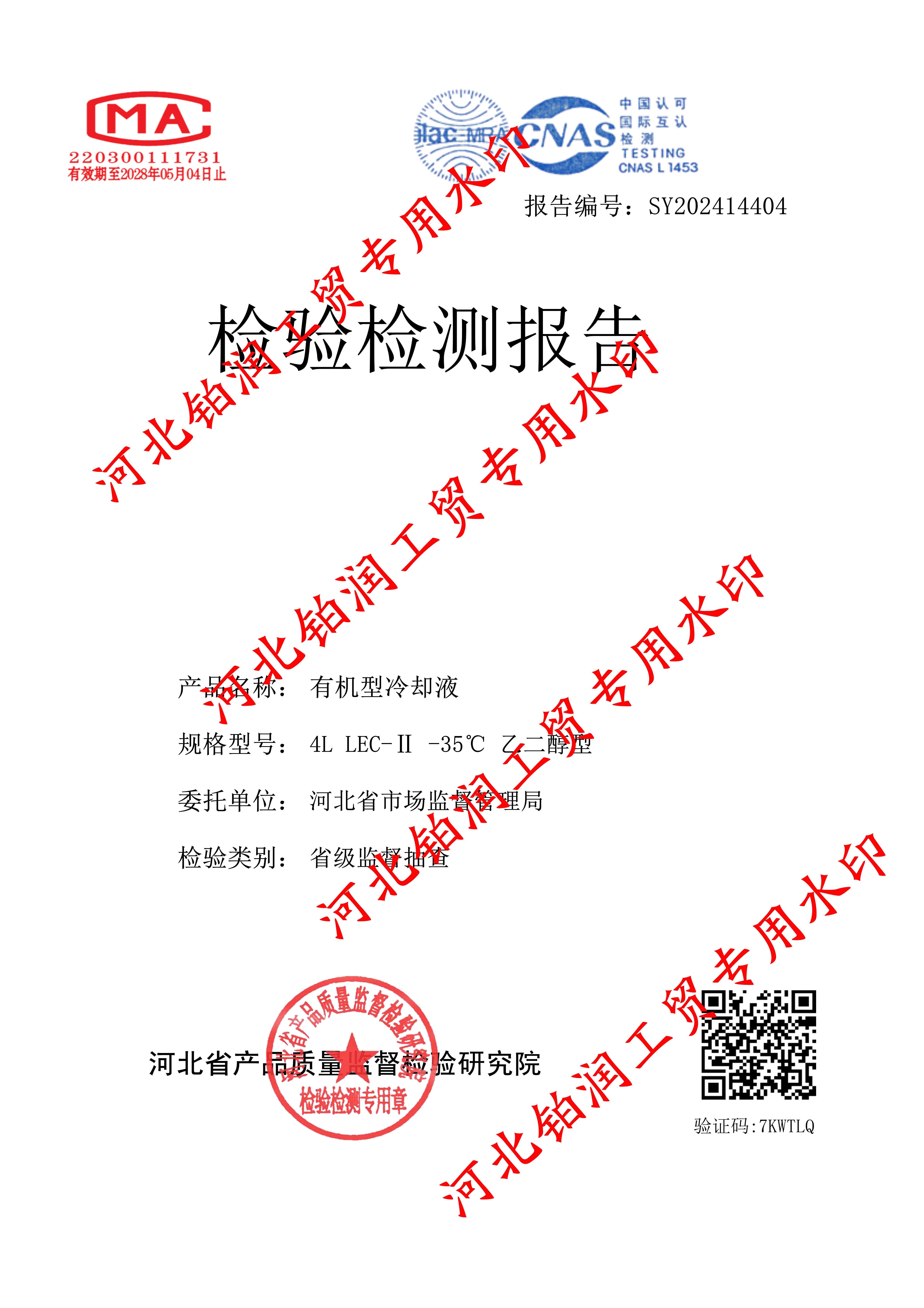 近期,河北省市场监督管理局对市面上防冻液进行了随机抽样检验。经后续河北省产品质量检验技术研究院检测,我司被抽检的“-35度乙二醇型冷却液”,各项理化指标均满足抽检标准,产品质量完全符合相关国家标准,并出具了相关检验报告单。