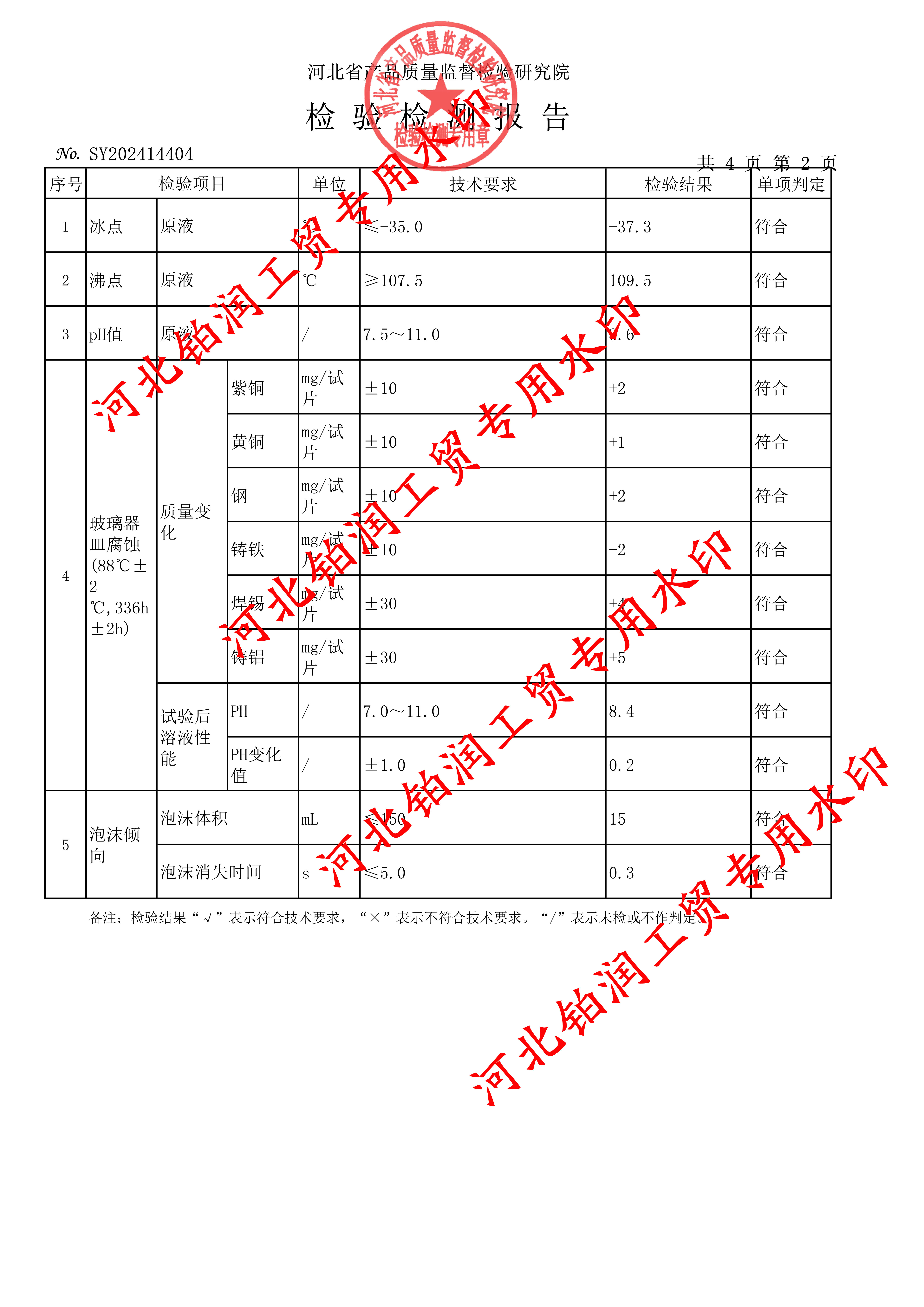 本次产品抽查依据GB 29743.1-2022 《机动车冷却液 第1部分:燃油汽车发动机冷却液》 《河北省机动车发动机冷却液产品质量监督抽查实施细则(2024版)》,国家标准要求,对机动车发动机冷却液的冰点、沸点、PH值、玻璃器皿腐蚀质量变化(紫铜、黄铜、钢、铸铁、焊锡、铸铝)、泡沫倾向性(泡沫体积、泡沫消失时间)等项目进行了相关检验,检验结果全部合格。