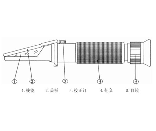 2、调整基准:测定前首先使用标准液(纯净水)、仪器及待测液体基于同一温度。掀开盖板②,然后取2~3滴标准液滴于折光棱镜①上,并用手轻轻按压平盖板②,通过目镜⑤看到一条蓝白分界线。旋转校正钉③使目镜视场中的蓝白分界线与基准线重合(0%) 。